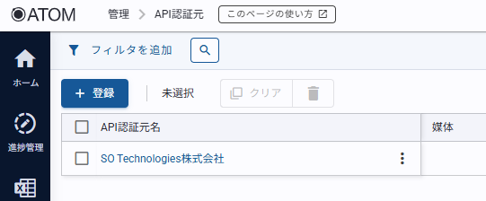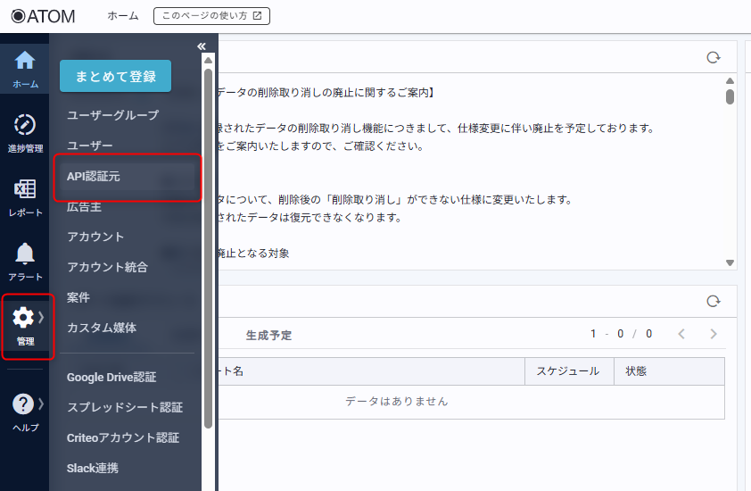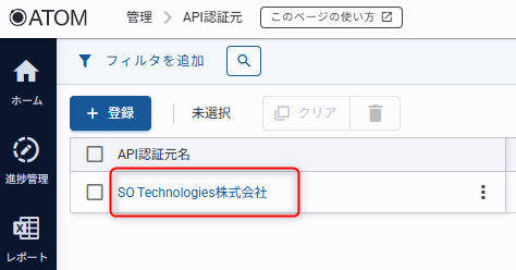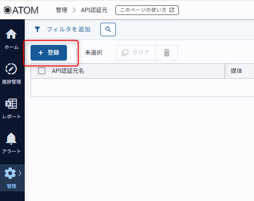 1. ATOM画面サイドバー[管理]の[API認証元]をクリックする