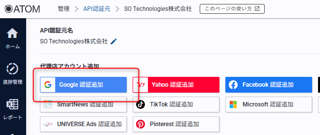 自社が広告代理店であり、自社だけがATOMを管理する場合、まずは自社名でAPI認証元を1つ登録し、各媒体の代理店アカウントを管理することをおすすめします。