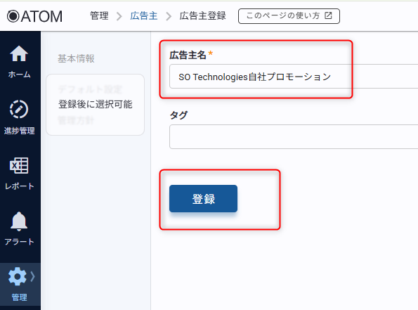 ATOMでは広告主ごとにアカウントを登録して管理します。