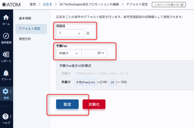 広告主との取引内容に応じてデフォルト(初期値)とする設定を行っていきましょう。設定した情報はいつでも変更できます。