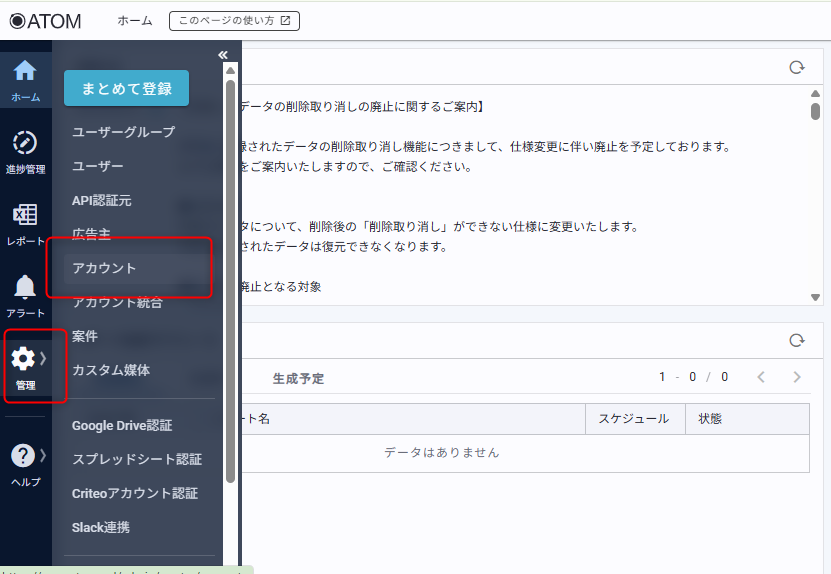 1. ATOM画面サイドバー[管理]の[アカウント]をクリックする