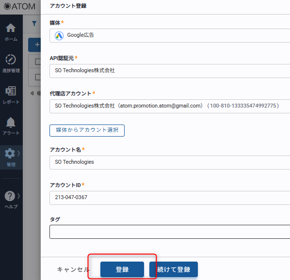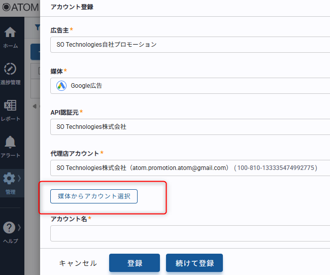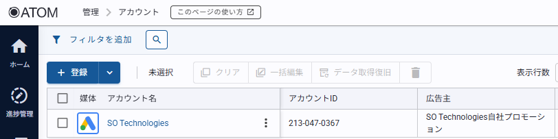 ATOMでは広告アカウントを「アカウント」として登録します。