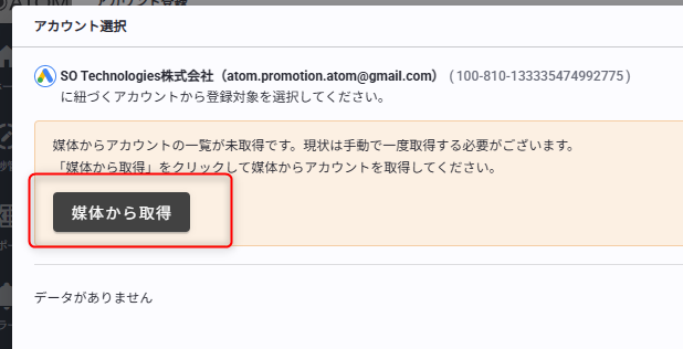 [媒体から取得]をクリックして代理店アカウントからアクセス可能なアカウント一覧を取得してください。