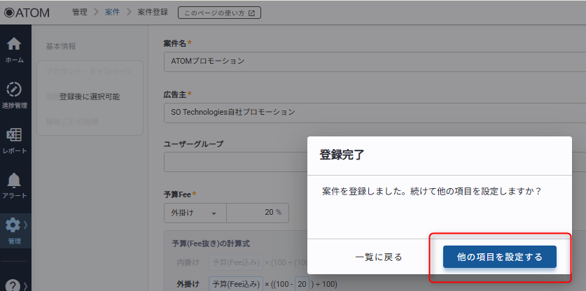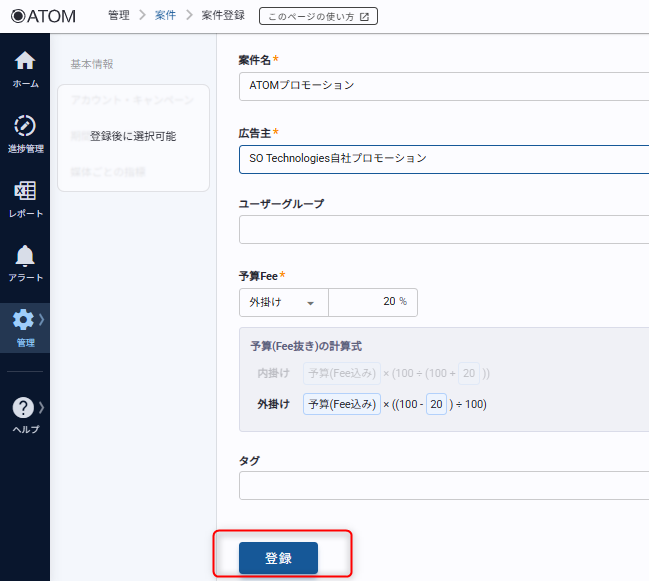 3. 「案件名」「広告主」「予算Fee」を入力して[登録]をクリックする