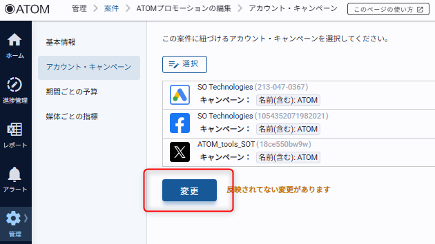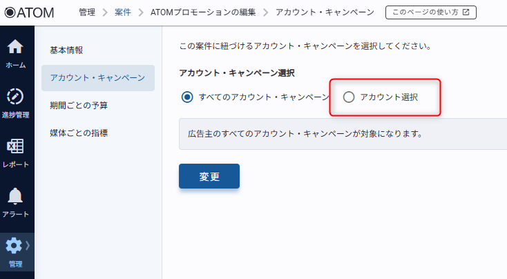 特定のアカウントやキャンペーンのみをレポートに出力したい場合は案件の「アカウント・キャンペーン」画面から出力対象とするアカウントやキャンペーンを設定していきましょう。