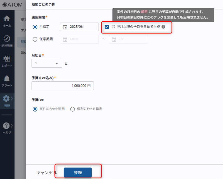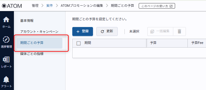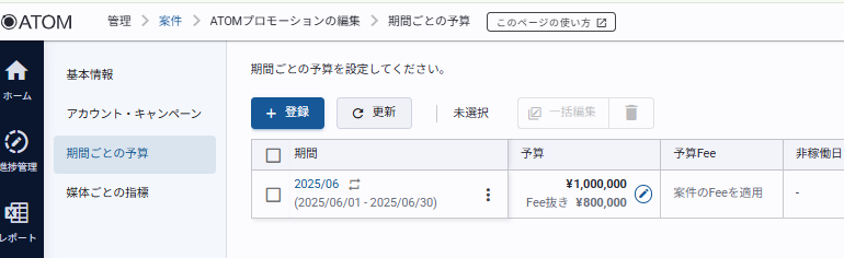 次いで案件の予算を設定していきましょう。案件の予算は月や任意期間といった期間ごとに設定します。