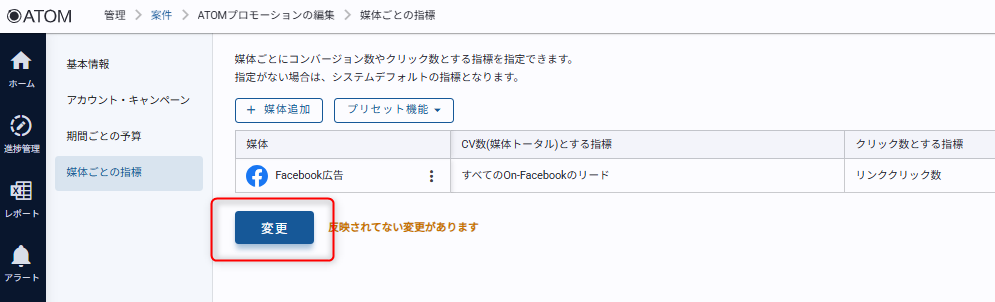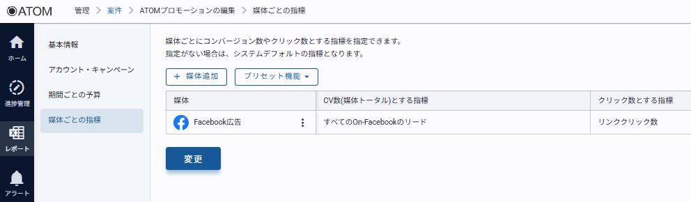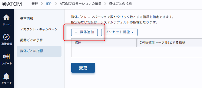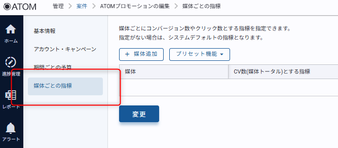 「CV数(媒体トータル)とする指標」の設定については案件に媒体ごとの指標を設定するを確認してください。