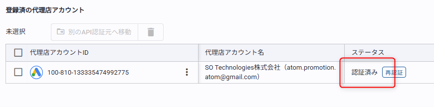 代理店アカウントが登録されました。ステータスが「認証済み」であることを確認してください。