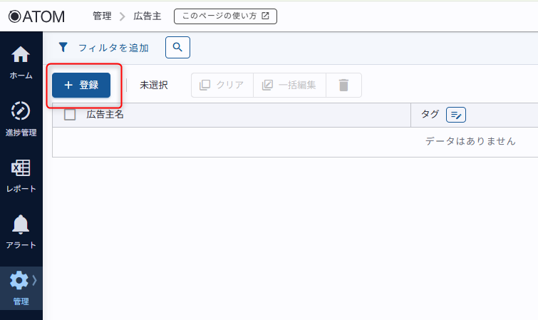 1. ATOM画面サイドバー[管理]の[広告主]をクリックする