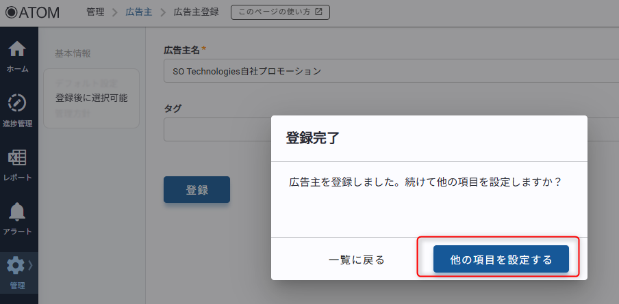 広告主が登録されます。[他の項目を設定する]をクリックして広告主に関する項目を設定していきましょう。