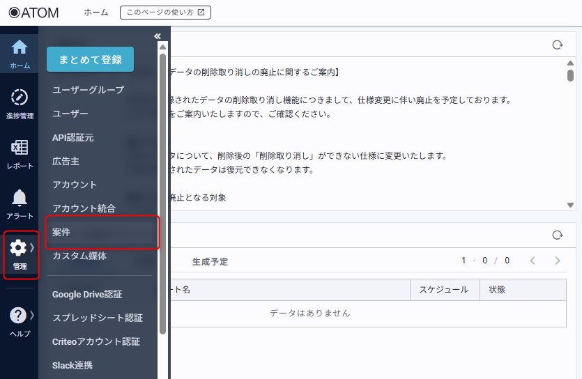 1. ATOM画面サイドバー[管理]の[案件]をクリックする