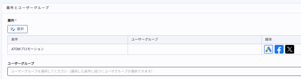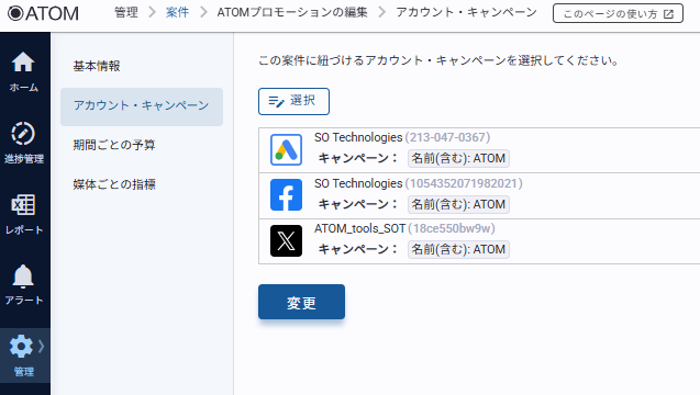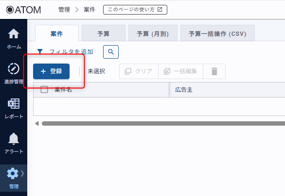 ATOMではプロモーションを行う対象とする広告主、アカウント、キャンペーンの組み合わせを「案件」として登録することで管理します。