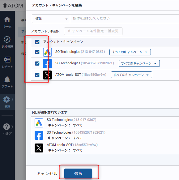 4. 出力対象キャンペーンを設定して選択ボタンをクリックする