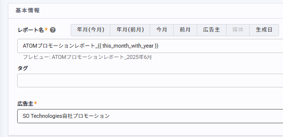 「広告主」と「媒体」は広告主と案件の設定を行うと設定可能です。