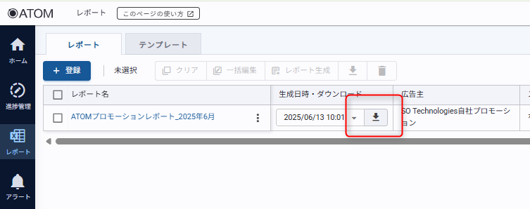 レポートが生成されると「生成日時・ダウンロード」欄のボタンからレポートのダウンロードが可能となります。