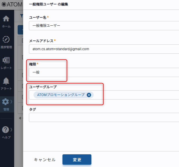 対象ユーザーに進捗管理とレポートの編集・閲覧権限が設定されます。