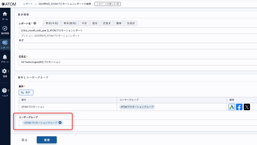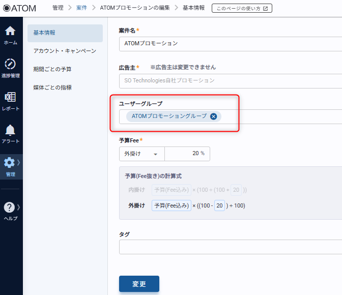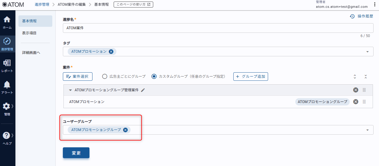 対象のユーザーにレポートや進捗管理の編集・閲覧権限を付与する案件に手順1で登録したユーザーグループを設定します。