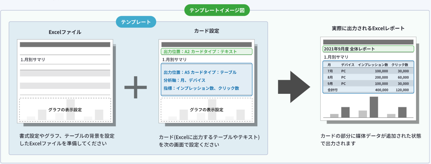 テンプレートとは、レポートに出力するデータやExcelファイルの形式を設定する機能です。
