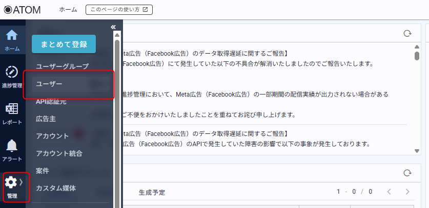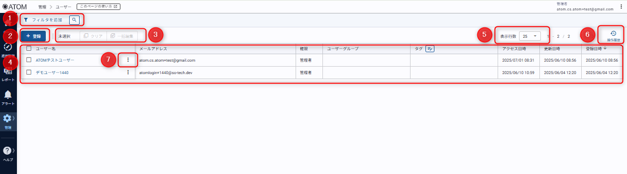 ATOM画面サイドバー[管理]の[ユーザー]からアクセスします。