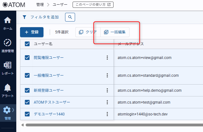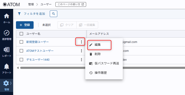 ユーザーを編集する ATOMサポートデスク 共有 登録したユーザーの情報を編集する方法を紹介します。ユーザーの編集手順1. ユーザー一覧画面内、編集したいユーザー名の三点リーダから[編集]をクリックする2. 項目を修正して[変更]をクリックする設定項目についてはユーザーを登録するを確認してください。ユーザー情報が更新されます。複数のユーザーを一括で編集したいときは ユーザー一覧画面内、[一括編集]を利用すると一括で編集が可能です。ユーザーの一括編集機能では権限、ユーザーグループ、タグの編集が可能です。