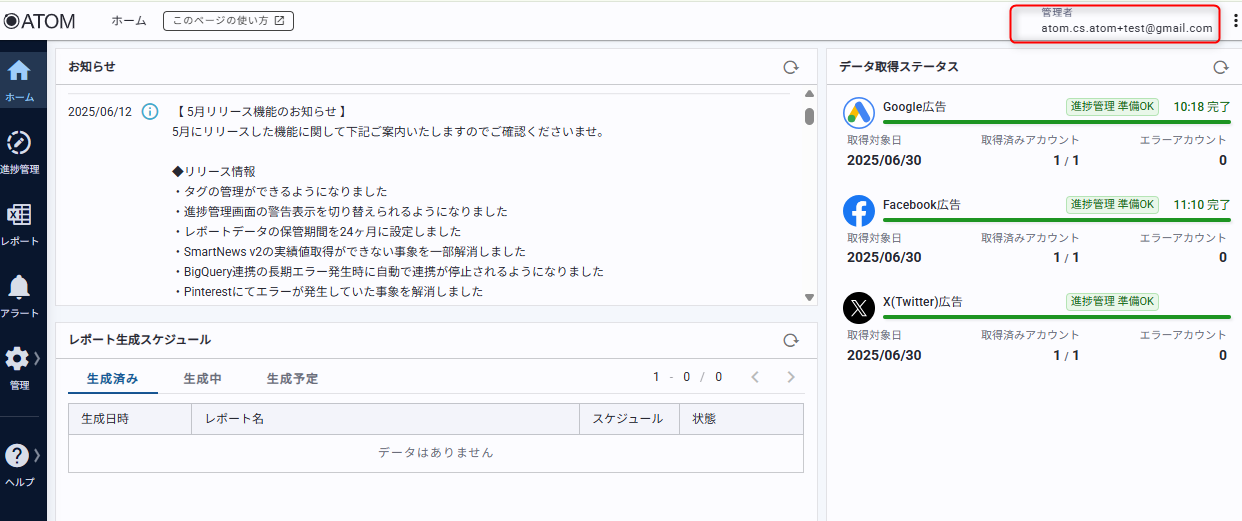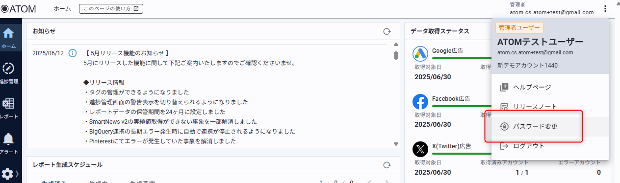 1. ATOM画面の右上に表示されるメールアドレスをクリックする