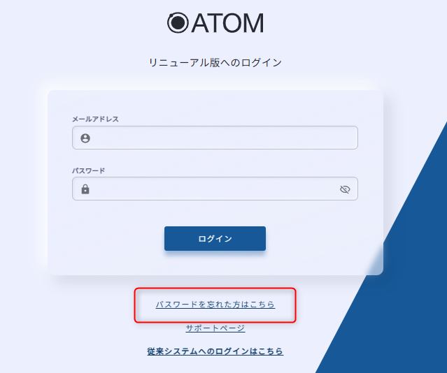 ATOMログイン画面の[パスワードを忘れた方はこちら]からパスワードリセット画面にアクセスしてください。