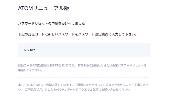 4. ATOMから送付されるパスワードリセットメールで認証コードを確認する