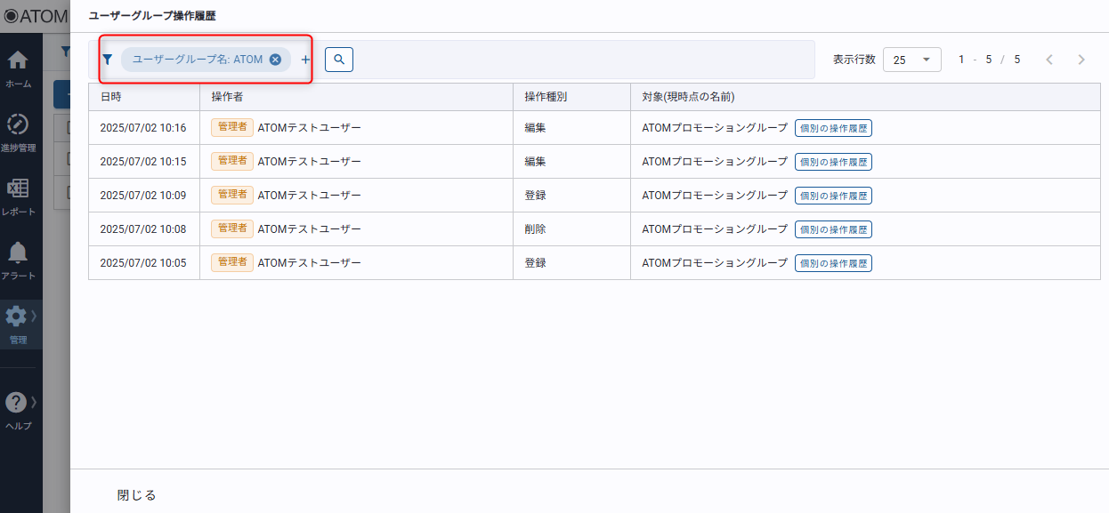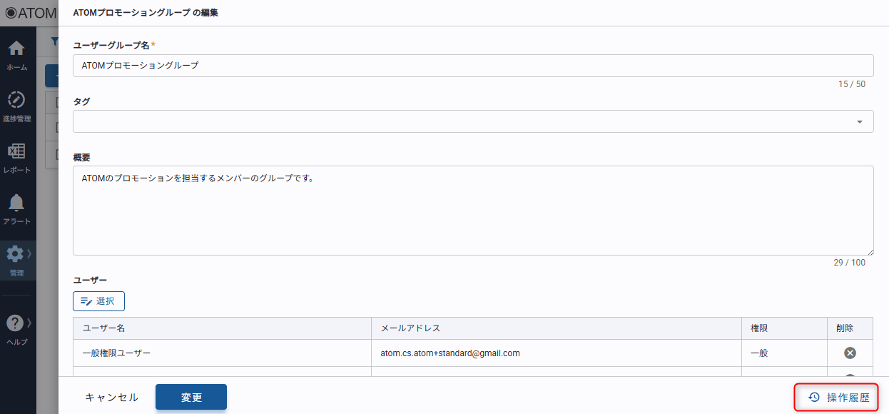 ユーザーグループ編集画面の[操作履歴]からも個別の操作履歴を確認できます。