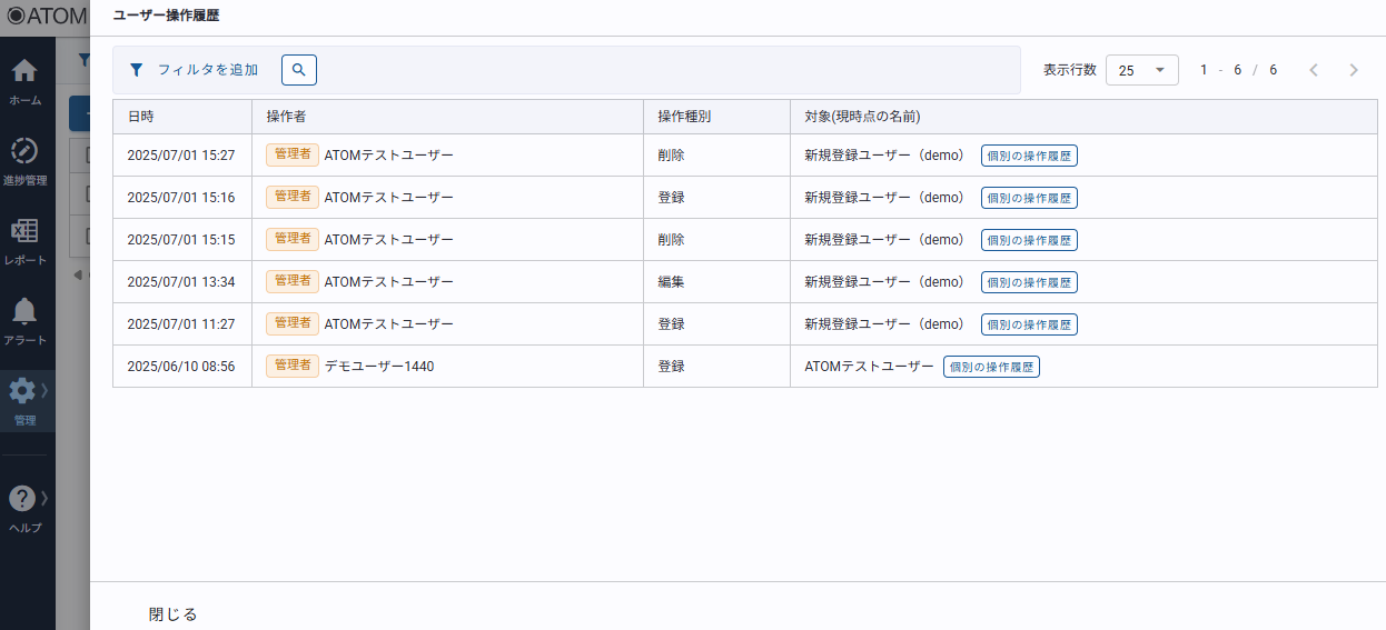 2. 操作履歴を確認したいユーザーの[個別の操作履歴]をクリックする