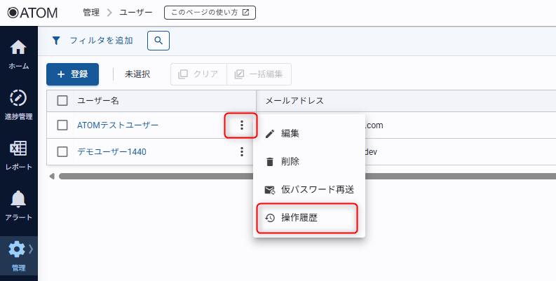 ユーザーグループ名の三点リーダ[操作履歴]からも個別の操作履歴を確認できます。