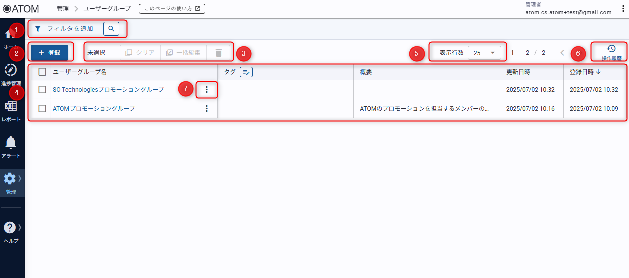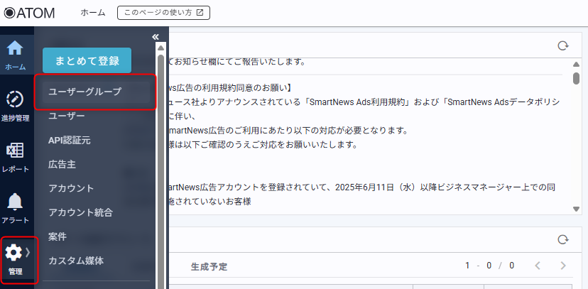 ATOM画面サイドバー[管理]の[ユーザーグループ]からアクセスします。
