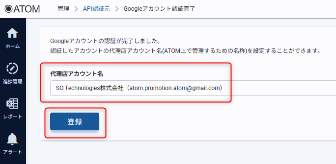 4. 代理店アカウント名を入力して[登録]をクリックする