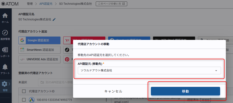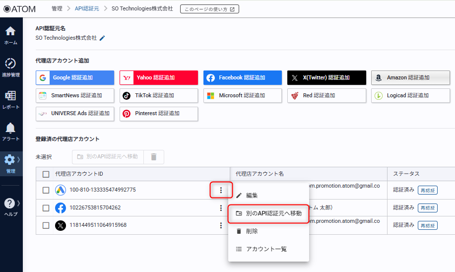 登録済みの代理店アカウントを別のAPI認証元に移動する方法を紹介します。