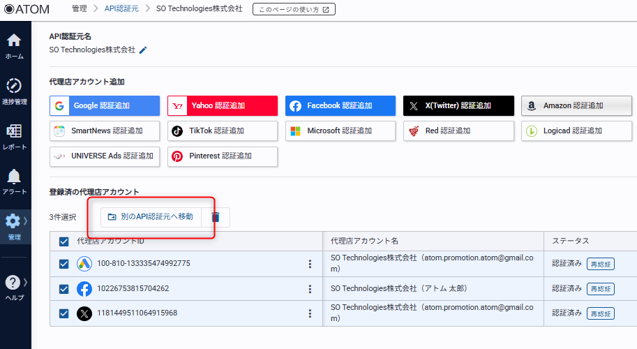 代理店アカウント一覧画面内、[別のAPI認証元へ移動]を利用すると一括で移動が可能です。
