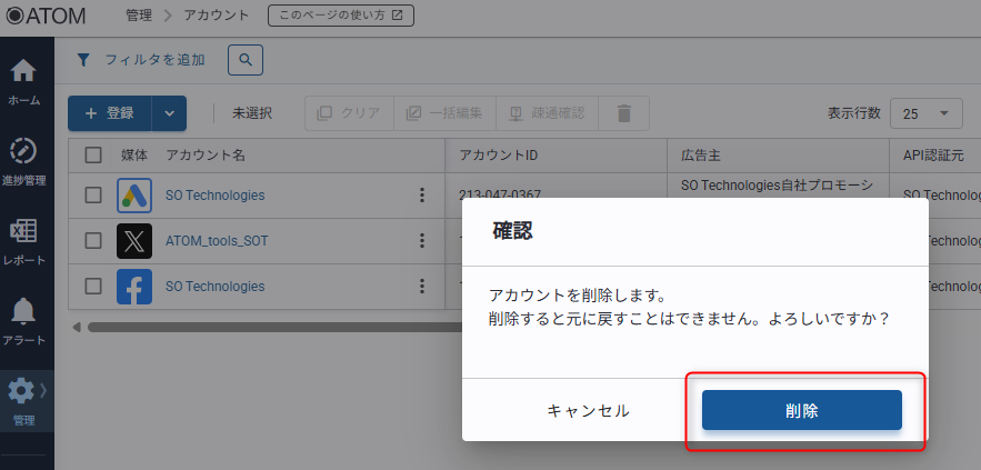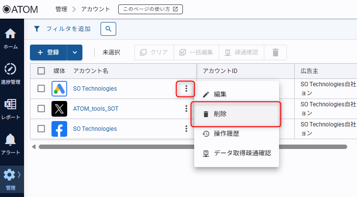 1. アカウント一覧画面内、削除したいアカウントの三点リーダから[削除]をクリックする