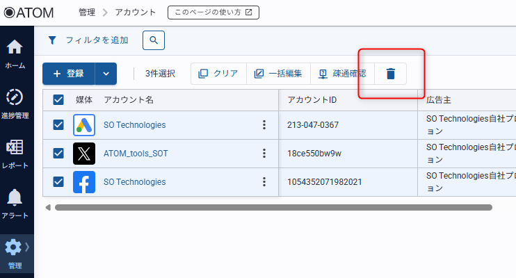 アカウント一覧画面内、ごみ箱ボタンから一括で削除することができます。