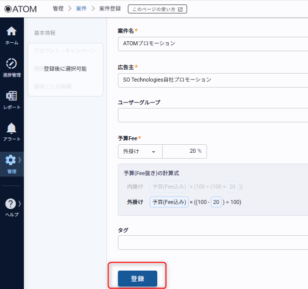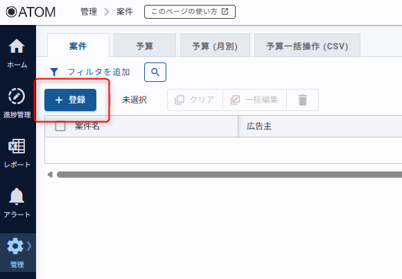 登録す案件の情報を入力して[登録]をクリックします。