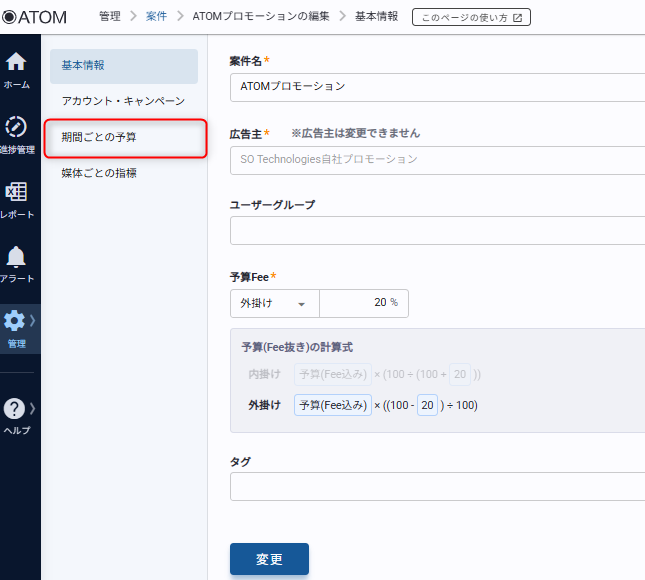 | 予算 (Fee込み) | 適用期間のFee込みの予算金額を設定します。 |