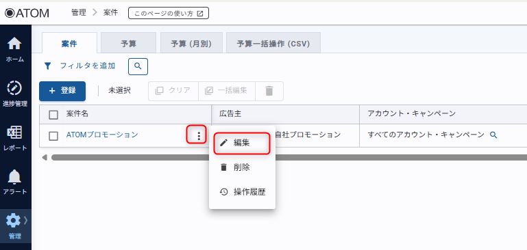 1. 案件一覧画面内、編集したい案件名の三点リーダから[編集]をクリックする