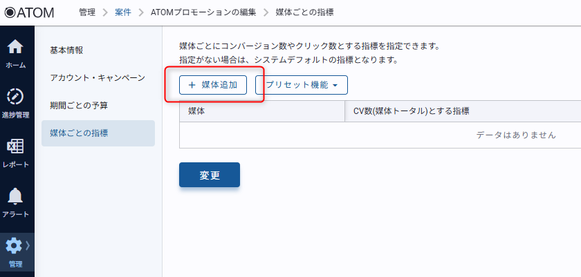 登録した案件に含まれる各媒体の「CV数(媒体トータル)」、「クリック数」として出力する指標を設定する機能です。