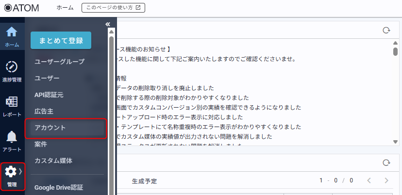 ATOM画面サイドバー[管理]の[アカウント]からアクセスできます。