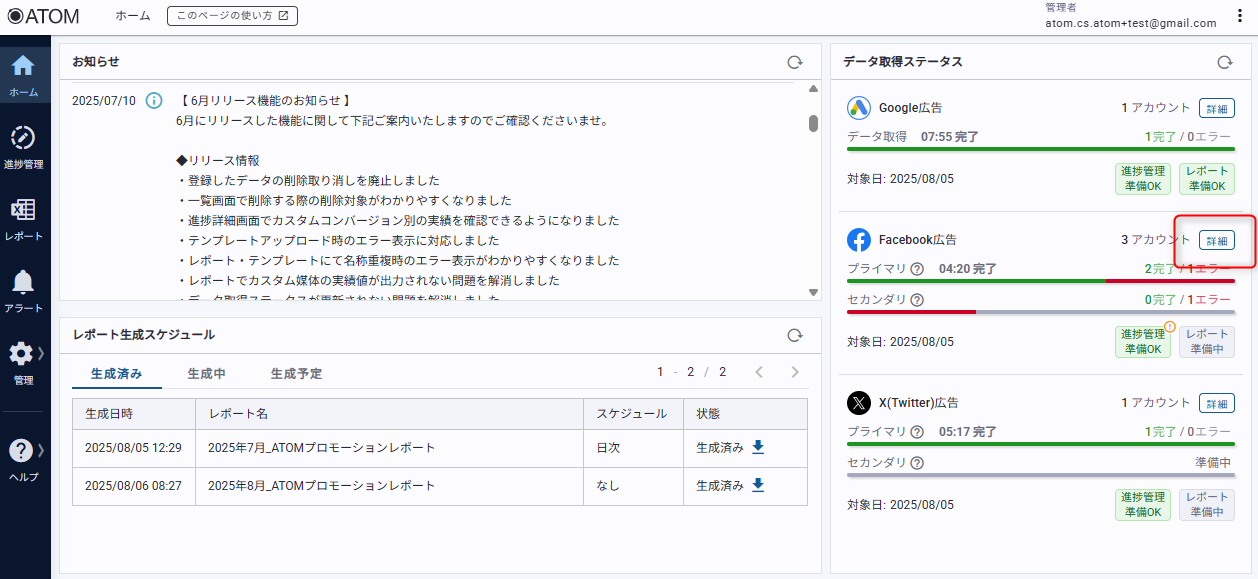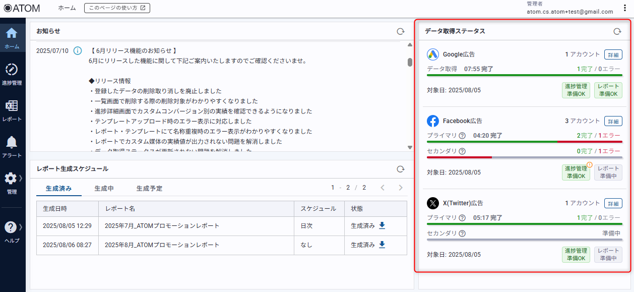 1. ATOMのホーム画面内、データ取得ステータスを確認する
