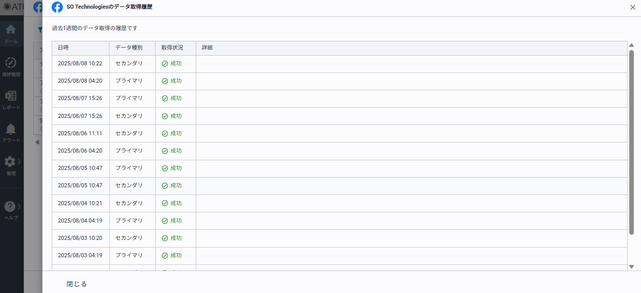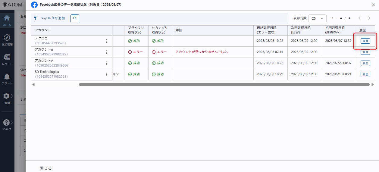 アカウントの[履歴]をクリックすると過去7日間のデータ取得履歴を確認できます。