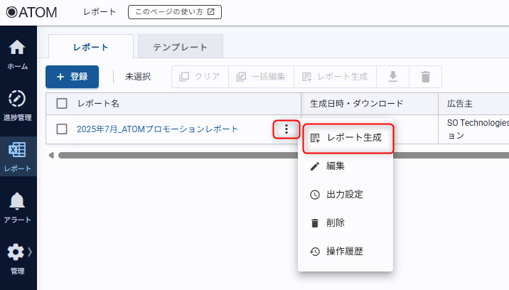 1. レポート一覧画面内、生成したいレポート名の三点リーダから[レポート生成]をクリックする