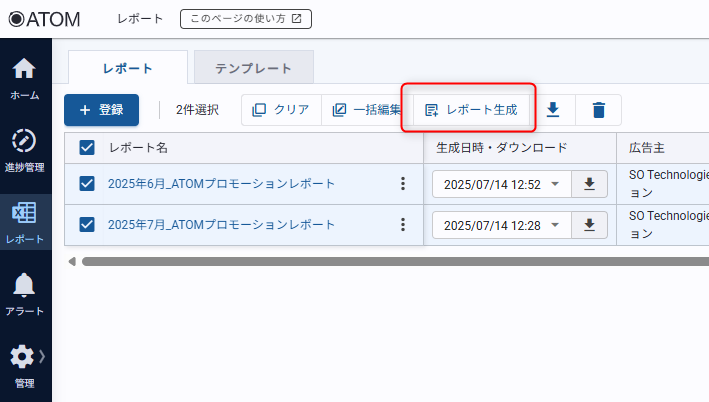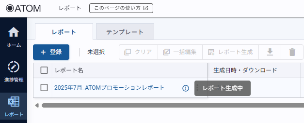 レポート一覧画面内、[レポート生成]から一括で生成することができます。