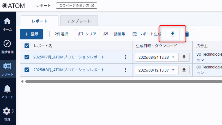 レポート一覧画面内、ダウンロードボタンから一括で生成ダウンロードすることができます。