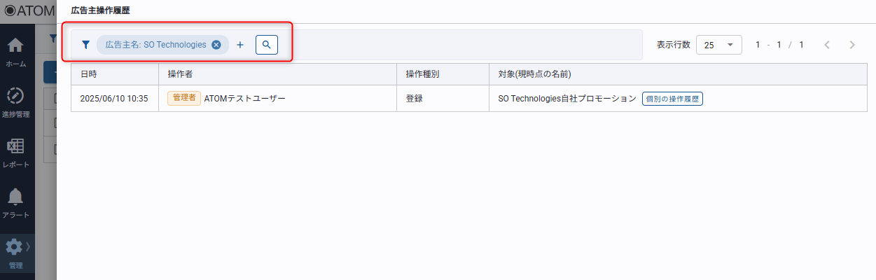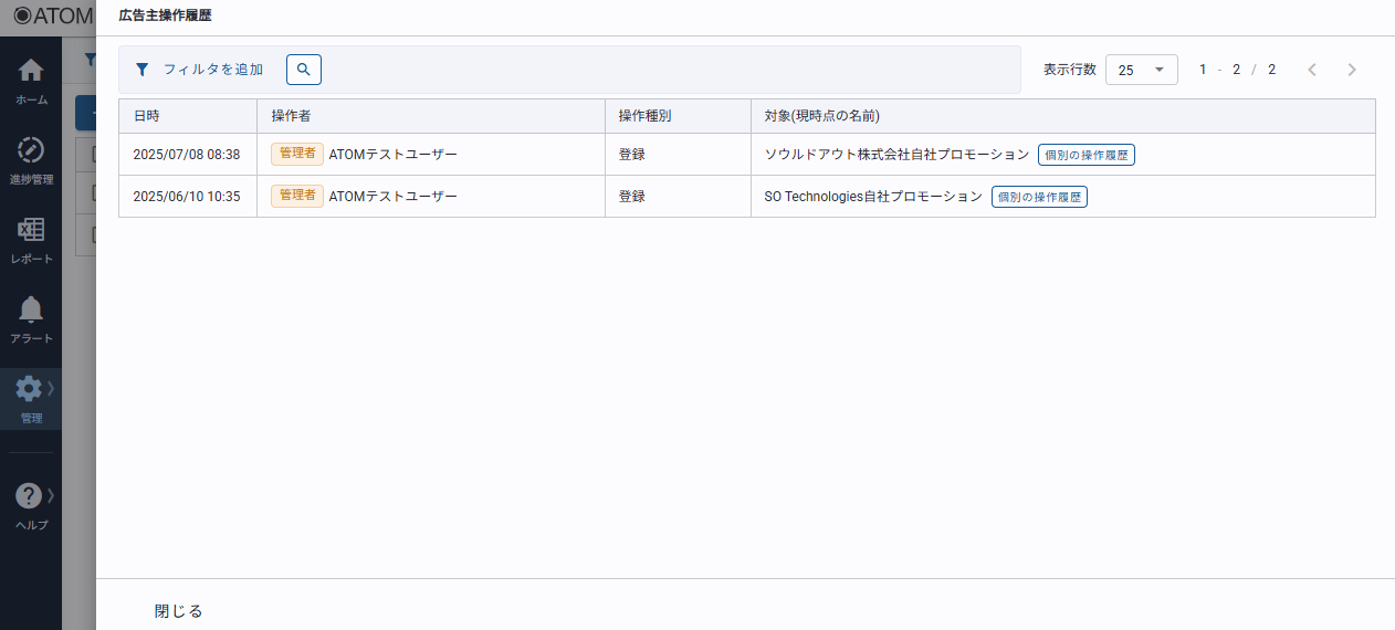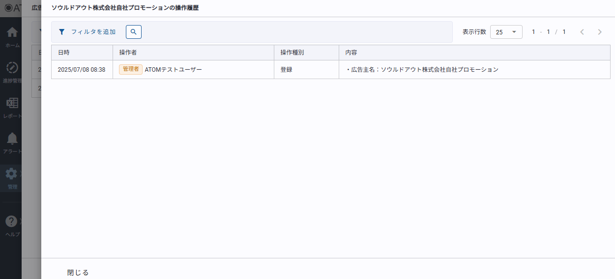 対象広告主に対する操作履歴が表示されます。