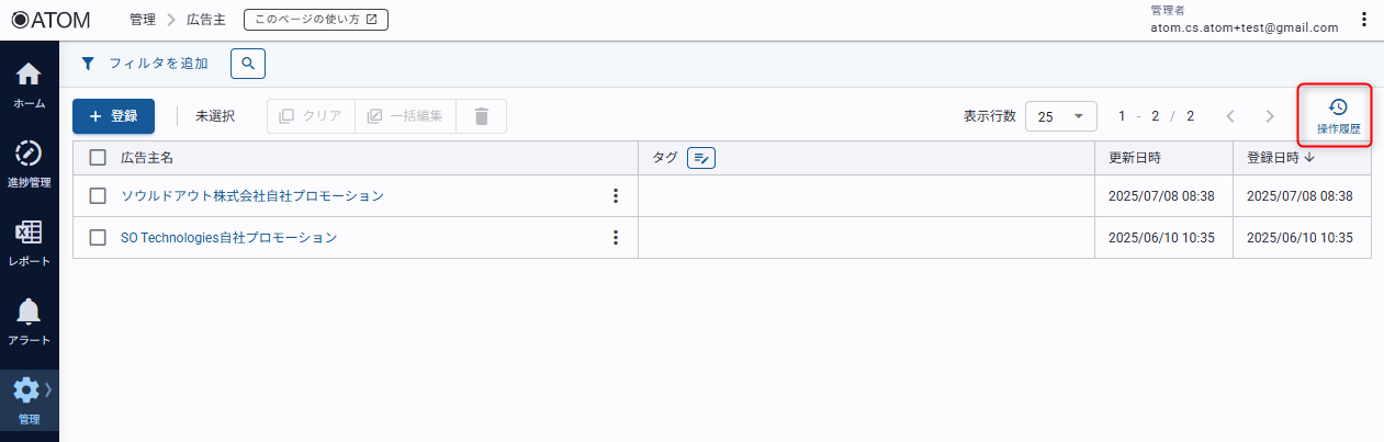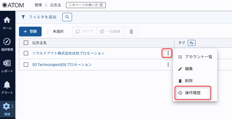 1.広告主一覧画面内、[操作履歴]をクリックする