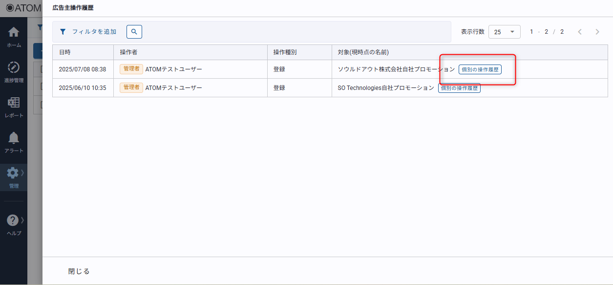2. 操作履歴を確認したい広告主の[個別の操作履歴]をクリックする