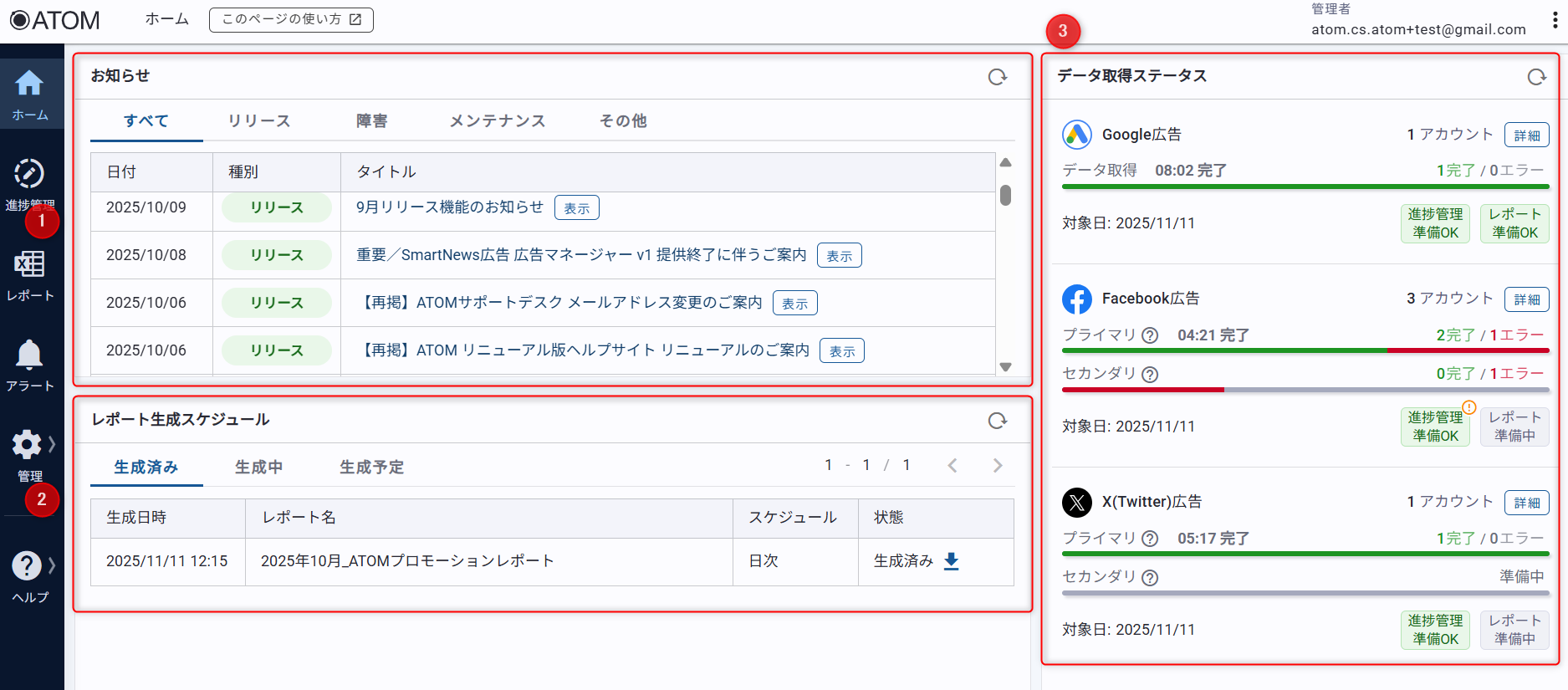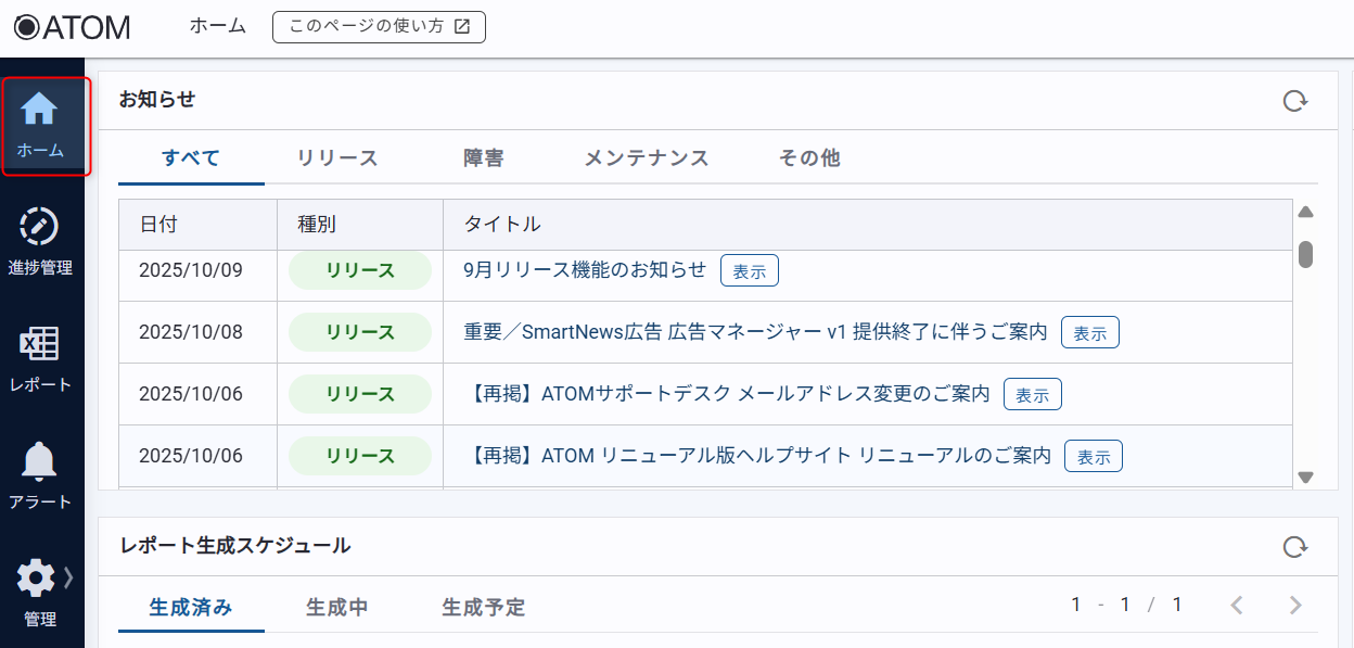 機能リリース、障害、メンテナンス情報など、ATOMからのお知らせが掲出されます。